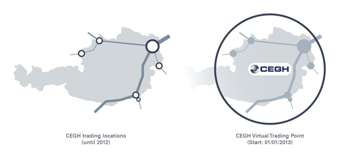 Zavedení Třetího energetického balíčku EU vyžadovalo implementaci nového vstupního a výstupního režimu (entry-exit regime). Místo transportu z bodu do bodu se fyzické pohyby plynu provádějí přes vstupní a výstupní body, nezávisle na dopravních cestách. Tím se oblast trhu ve východní části Rakouska změnila na jednu zónu, která zahrnuje přepravní, zásobovací a skladovací aktivity. Dalším důsledkem zavedení nového režimu je přeměna oddělených obchodních míst v celém Rakousku na jeden Virtuální Obchodní Bod provozovaný společností CEGH.