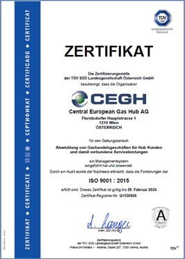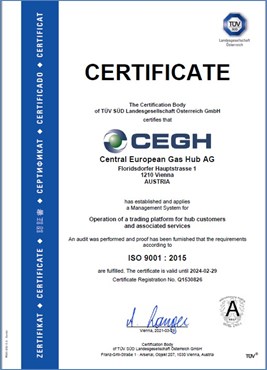 Since 2009, Central European Gas Hub AG has been certified according to the quality management standard EN ISO 9001. This standard defines the minimum requirements in terms of quality control, which have to be fulfilled by companies, in order to provide products and services that meet their customers’ expectations and regulatory obligations. Moreover, the management system should be subject to constant improvement.