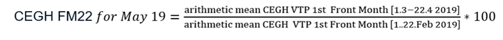 The CEGH FM 22 is published as a special index for the Gas Market in Austria. It is based on the First Front Month contract of the EEX CEGH Gas Exchange Futures Market, calculated as an average price of all trading days from the first calendar day of a month until day 22 of the respective month. The value of the starting month (contract March 2019) is the basis 100, and the index is then calculated for each month as the deviation in relation to the starting month.